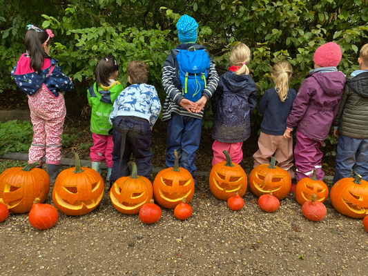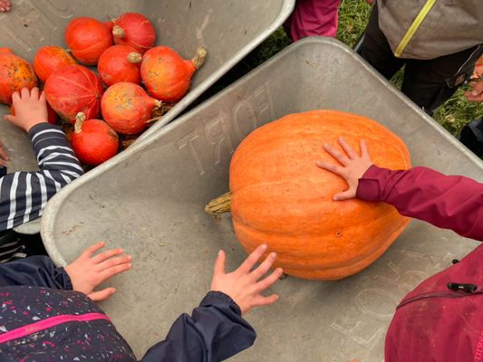 Auch die Bauernhoftiere freuen sich schon. Denn am Ende verfüttern wir gemeinsam alle Kürbisreste an die Schafe, Gänse und Hühner!